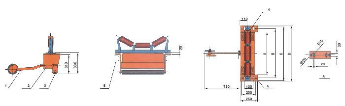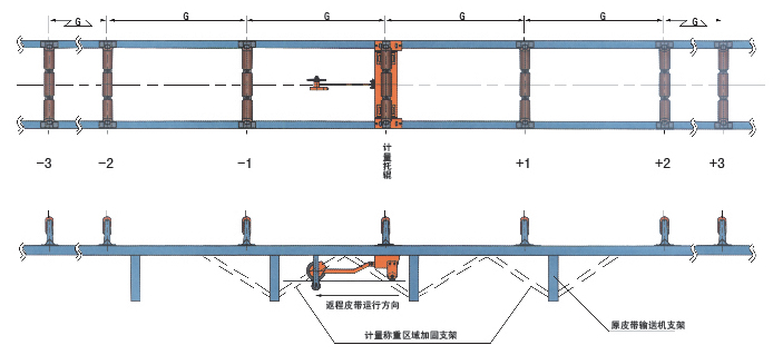 說明:1、測速車及測速傳感器 2、稱重架 3、輔助輥 4、原輸送機(jī)托輥改制的計(jì)量托輥 5、輸送機(jī)框架